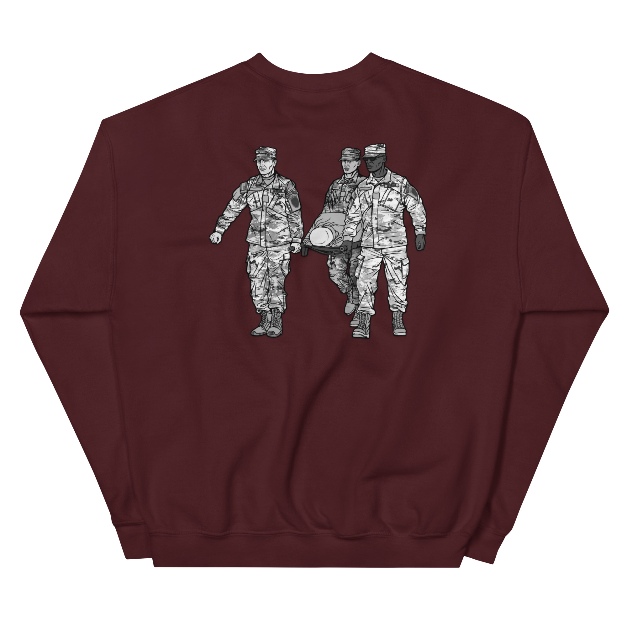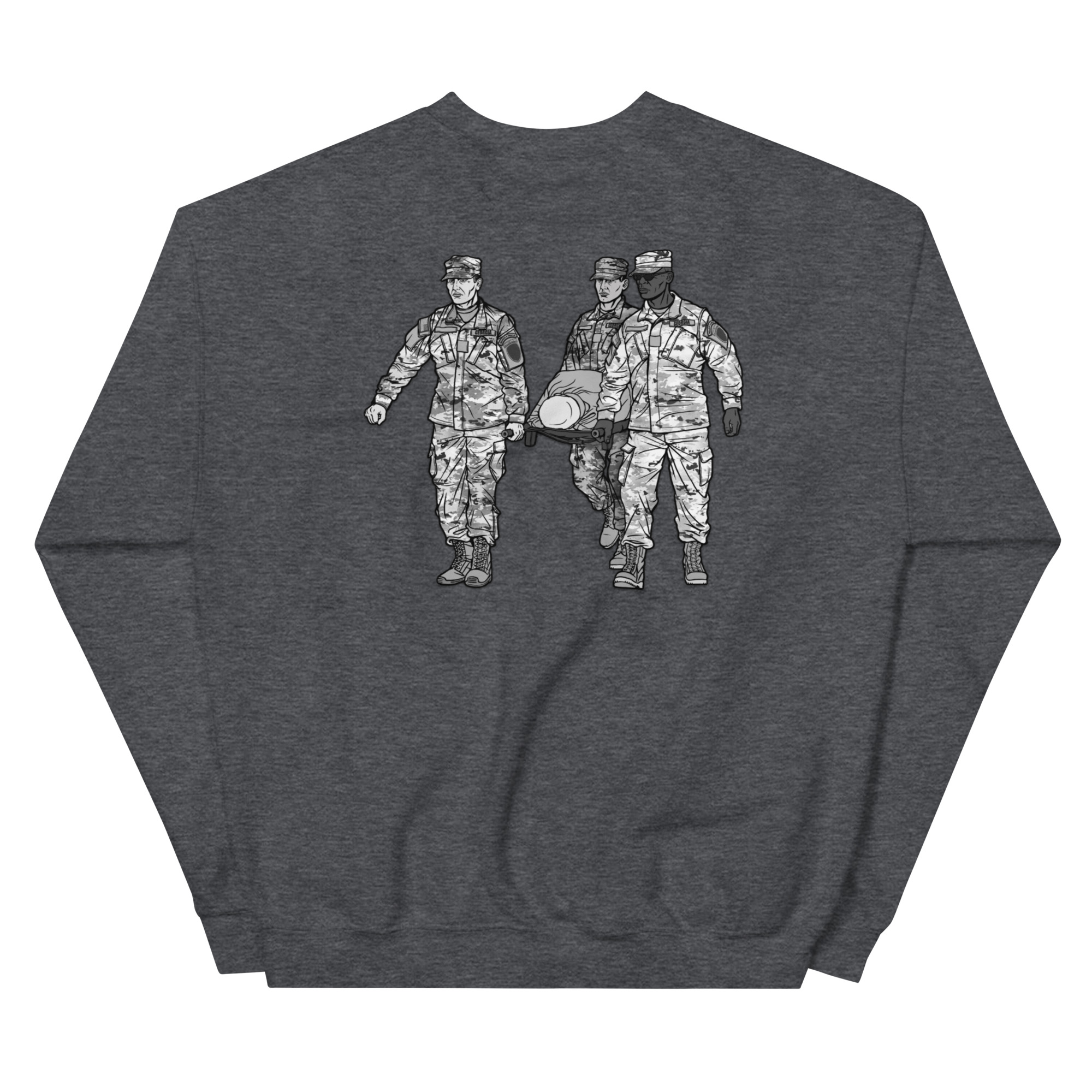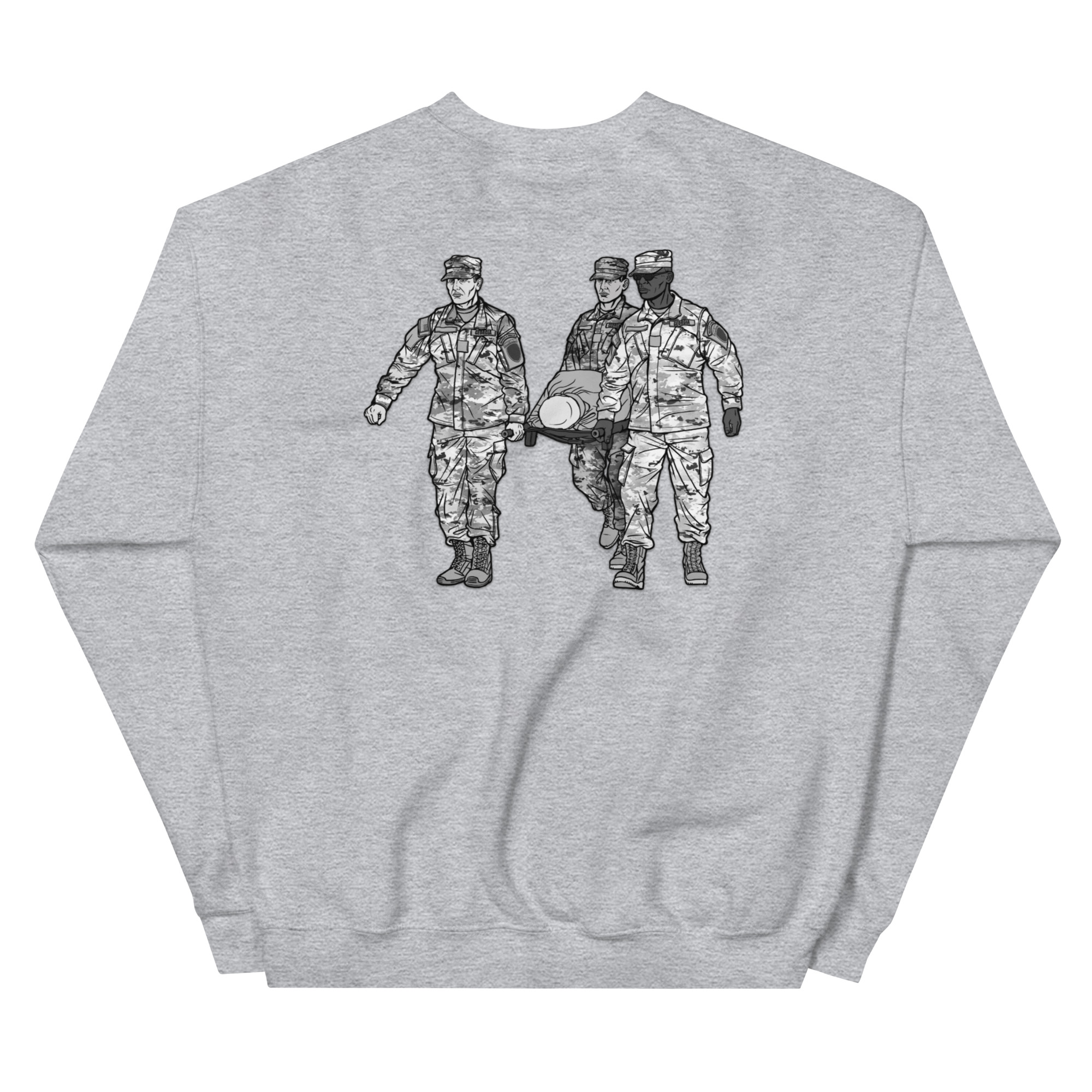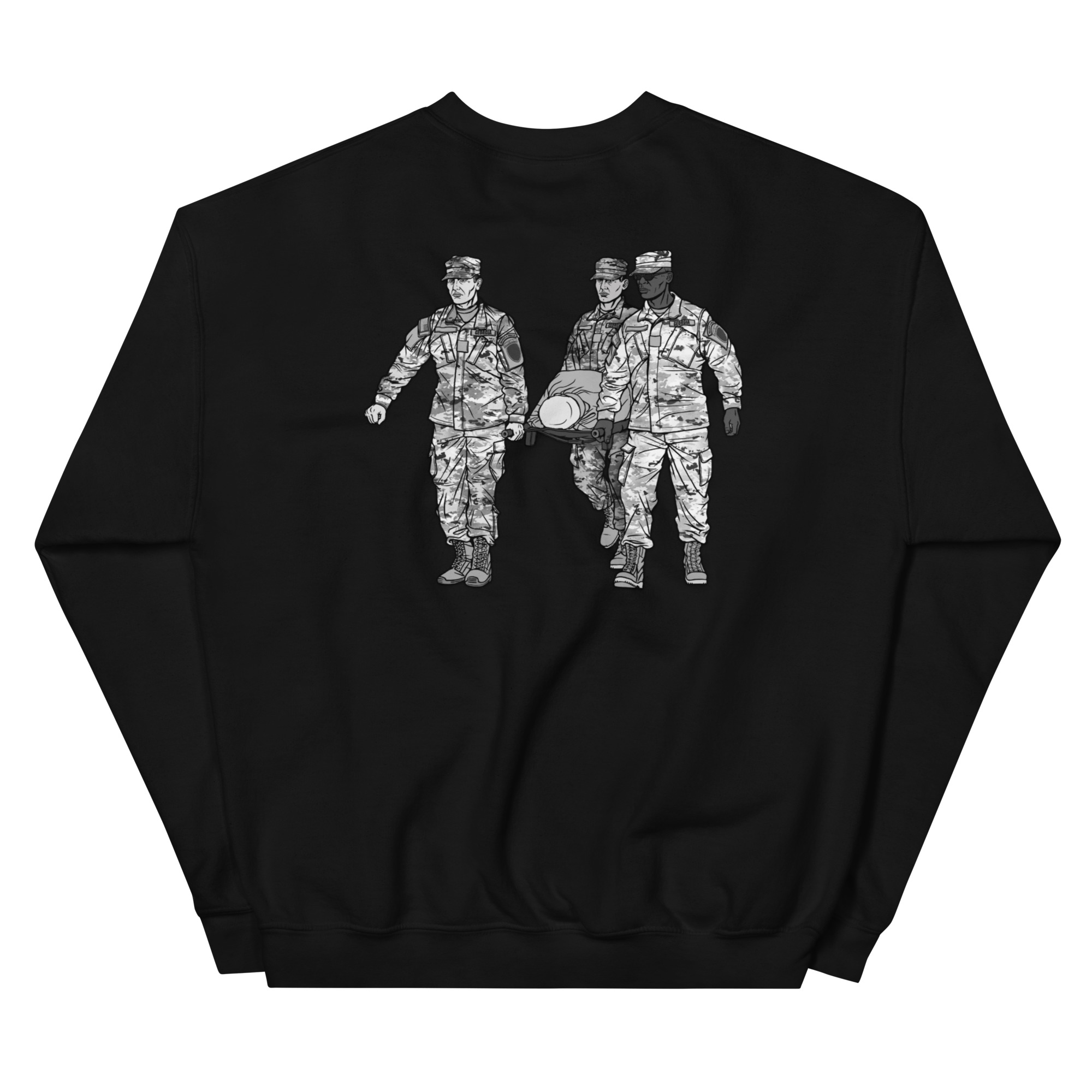 We had a professional graphics artist draw a unique design that features the Georgia State Defense Force Search & Rescue (SAR) Team in Action. The back of the sweater features three soldiers carrying a casualty while the front of the sweater features the SAR Tab.