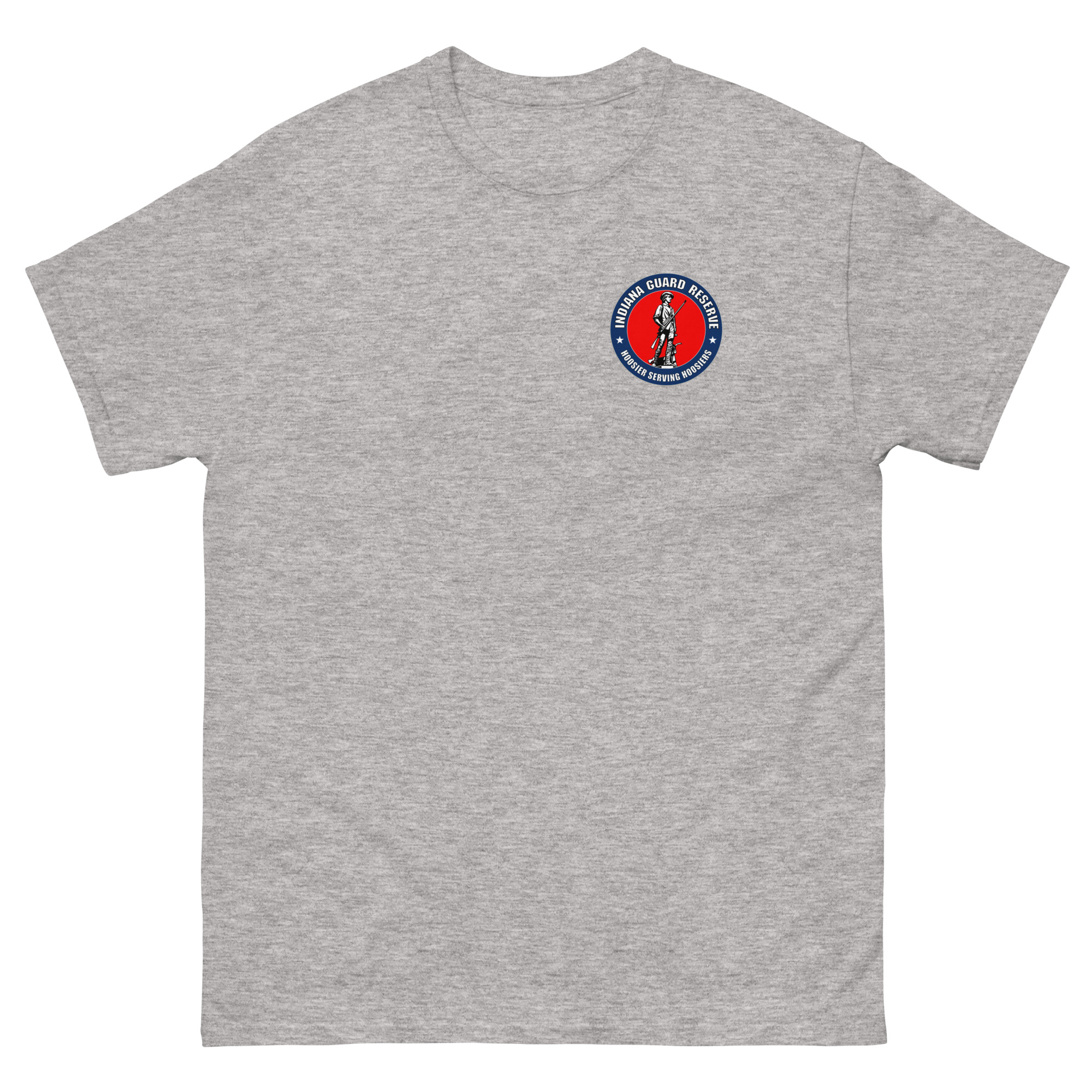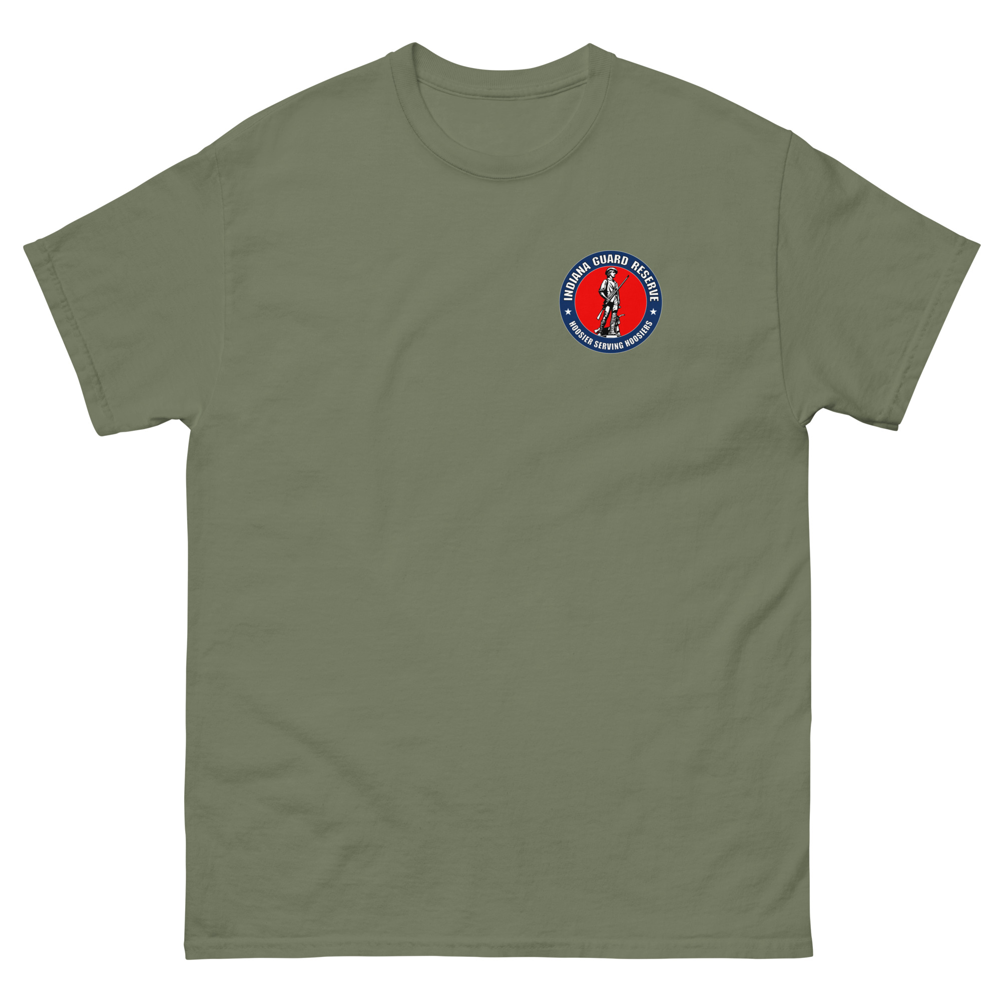 We designed a custom Indiana Guard Reserve T-Shirt written on the shirt as Indiana Guard Reserve & The American Minuteman highlighted in bold red.