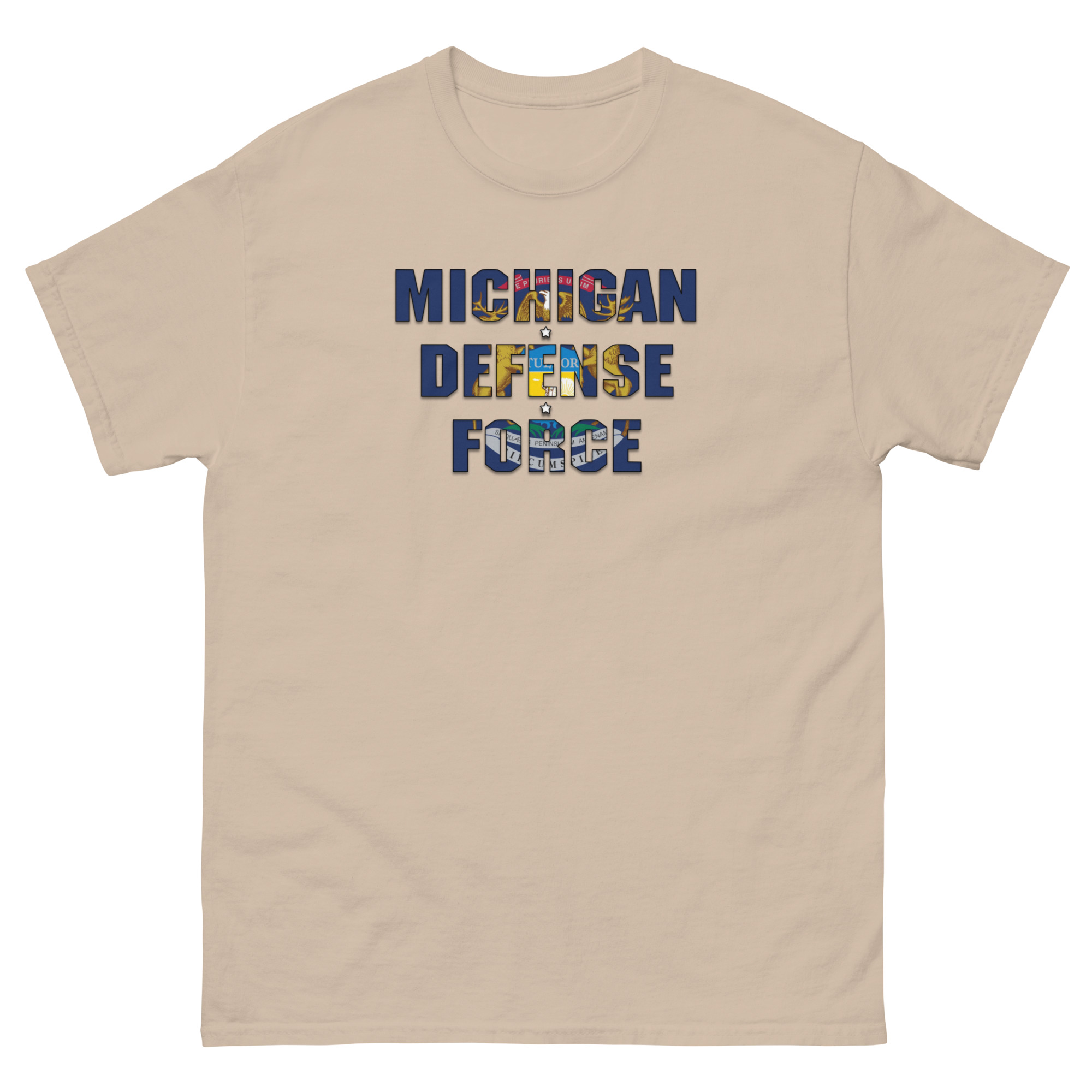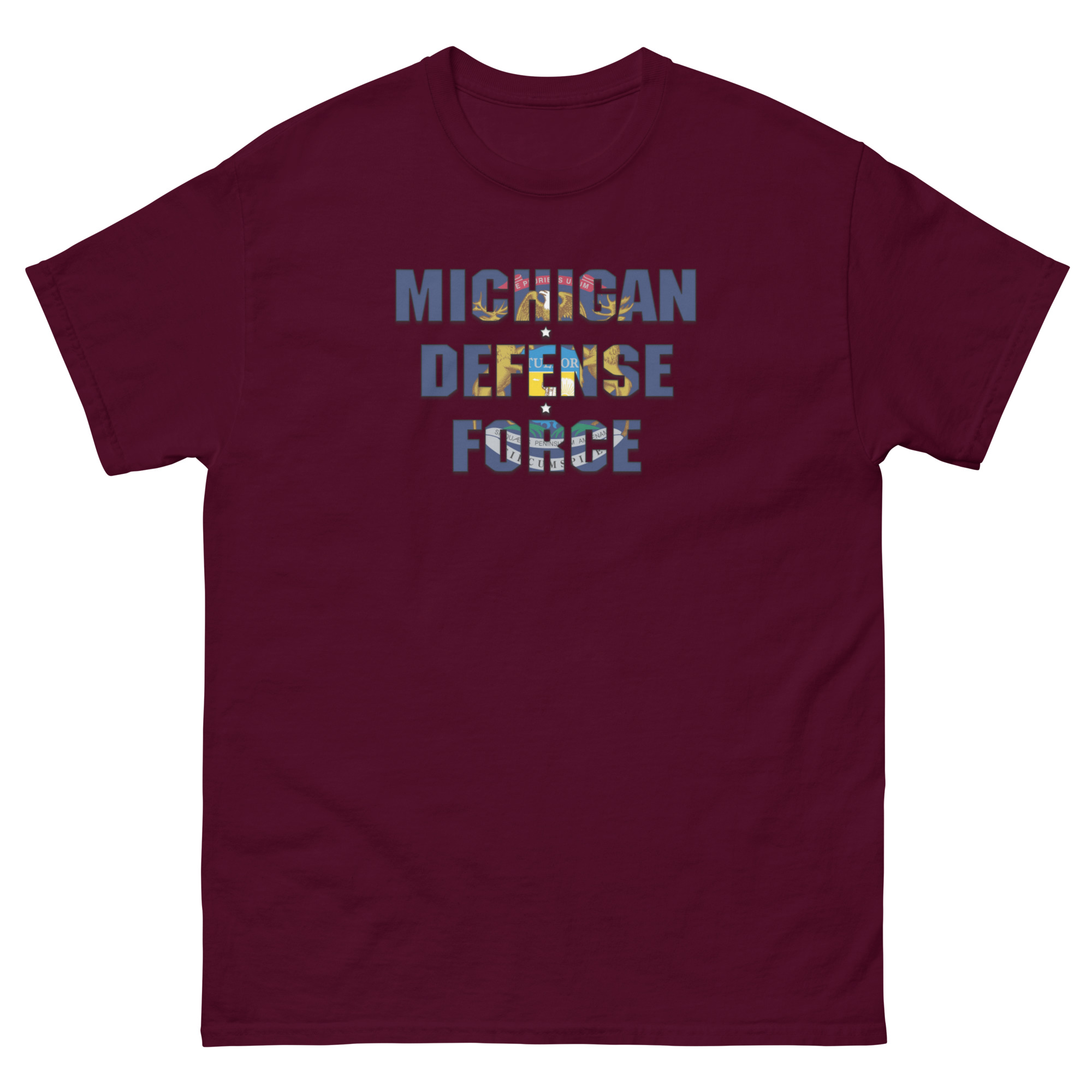 We designed a T-Shirt that Illustrates Michigan Defense Force with the Michigan State Flag.
