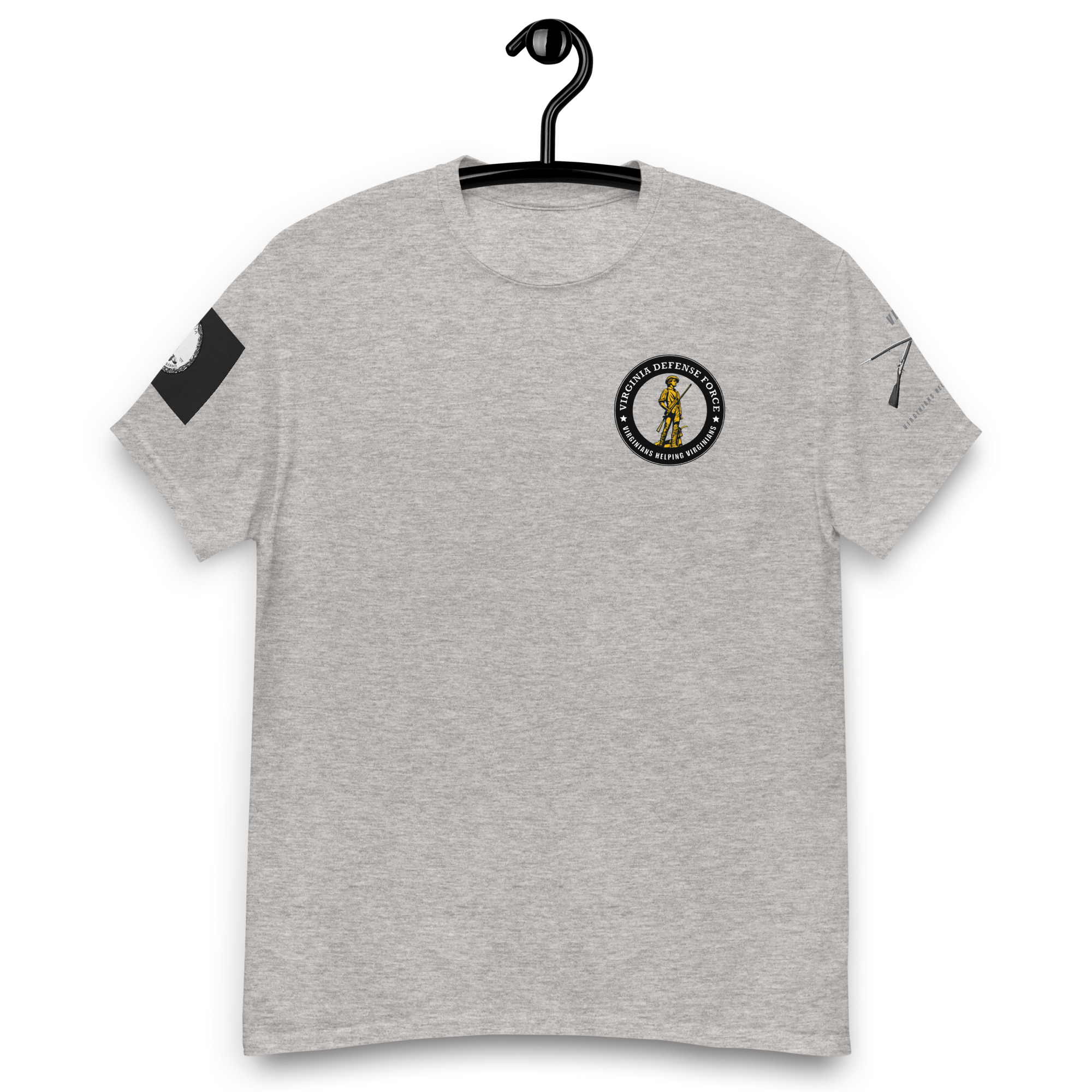We designed a new custom T-Shirt for The Virginia Defense Force. This shirt features The American Minuteman Emblem on the Front, Virginia State Flag on The Right Sleeve & Brown Bess Musket on The Left Sleeve.